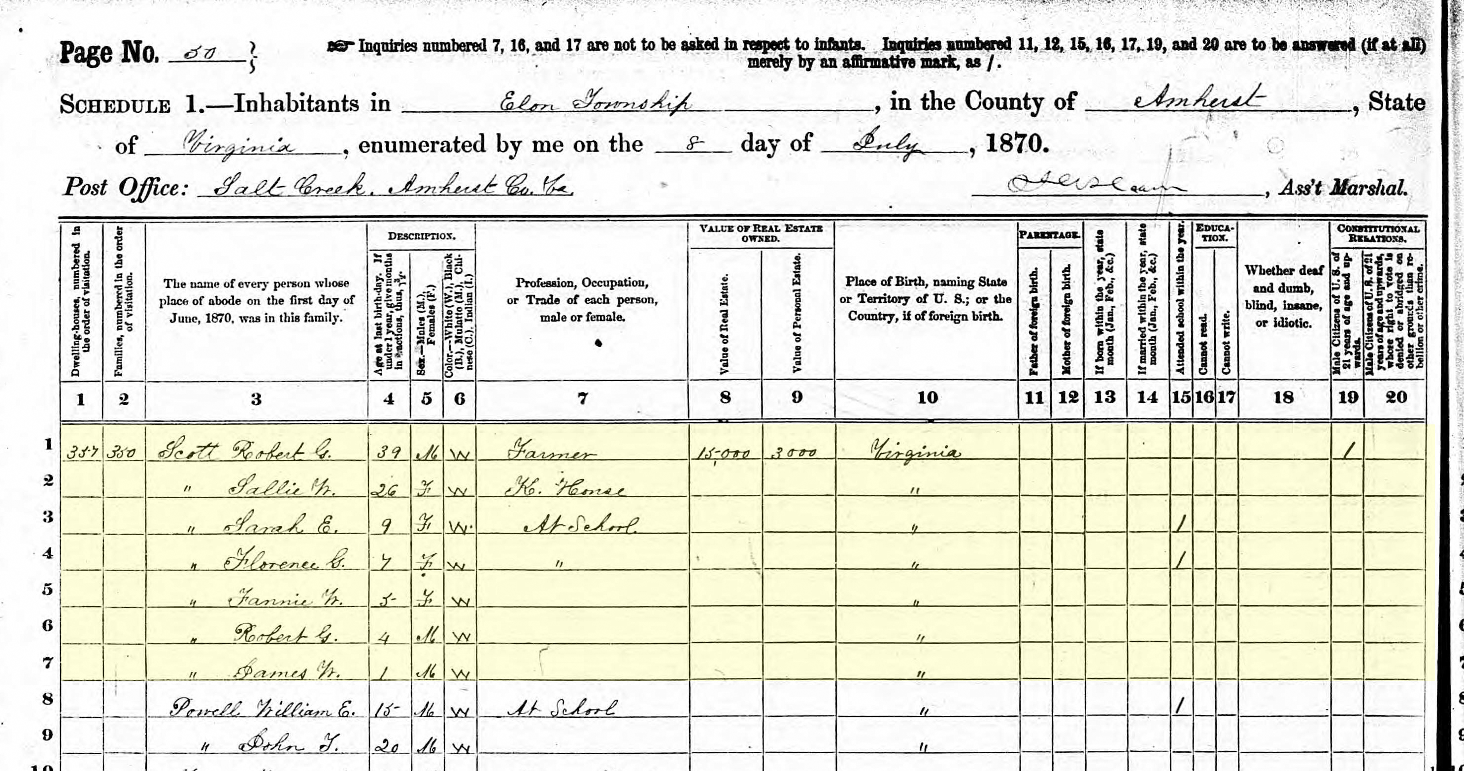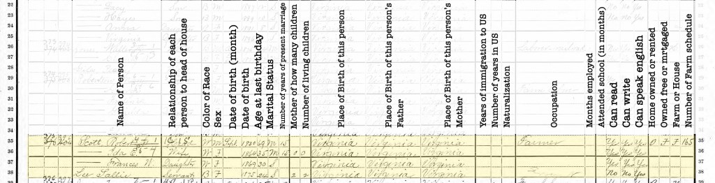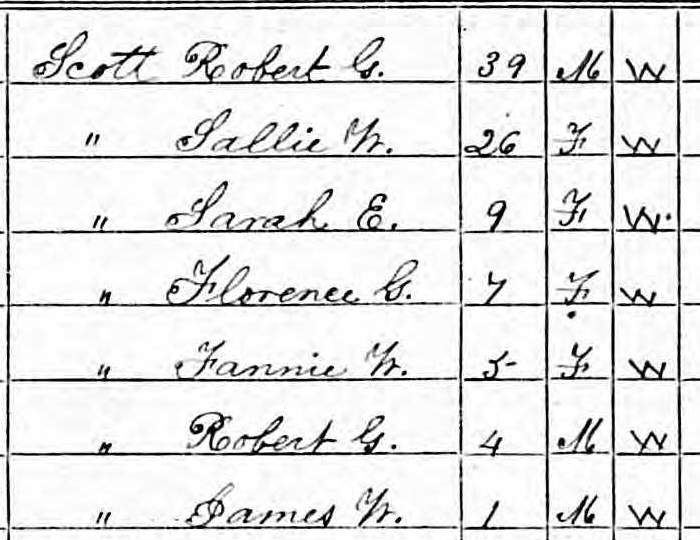 Let’s talk about the 1870 census. At this point, Robert has been married to his inappropriately young wife for a little over a decade. One of his sons, my great-grandfather William Edwin, was born after Robert (the four-year-old listed in this census) and before James. So where is William Edwin? Also, James wasn’t born for another six months after this census was supposedly taken. Not to mention his name was James Pendleton Scott. So who is this James W clown listed up there at the bottom?