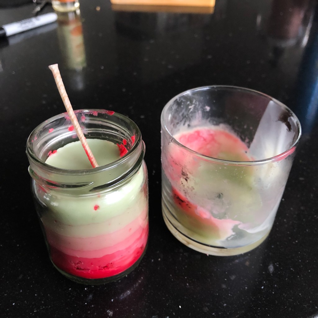 On the left is a smaller candle I made once the medium-sized one I first made burned down. I found the middle sized one didn’t burn very evenly, so I thought I’d try a smaller container. So far so fine.