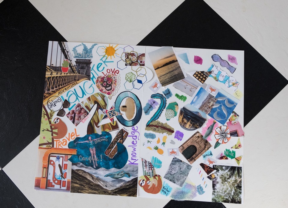 So, we started by filling out kid-friendly worksheets that had us reflecting on the past year. Then we made a collage about the coming year, filled with pictures and colors we like, and with words on it that inspire us. The pages I had were huge and I knew smaller ones would be easier to fill up, so I suggested that we each do one half, so when they were joined together, they said “2020”