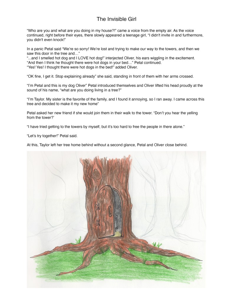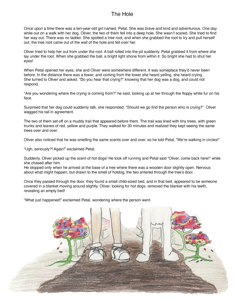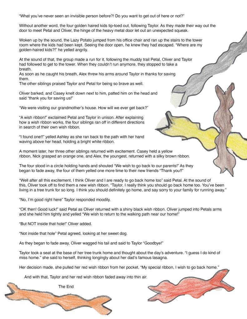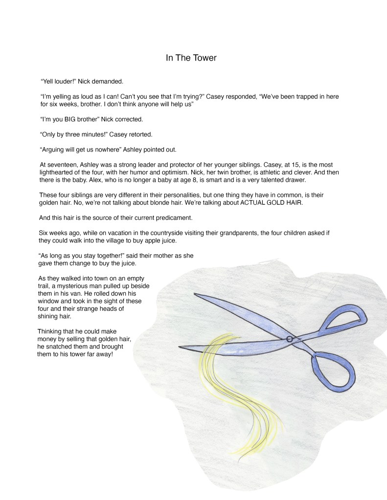 So for about four visits we worked together over FaceTime and wrote a little story which she entitled “The Mystery of the Golden-Haired Kids”. This title amuses me to no end because we never got around to really explaining why some of the characters had actual gold hair. And there was no mystery to this weird gold hair. It was a whimsical suggestion I planted into the storyline in an effort to add levity to the kidnapping story line which could have gotten very dark without it.