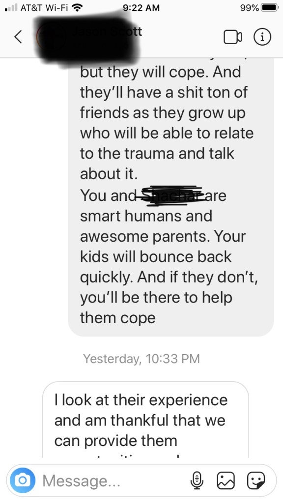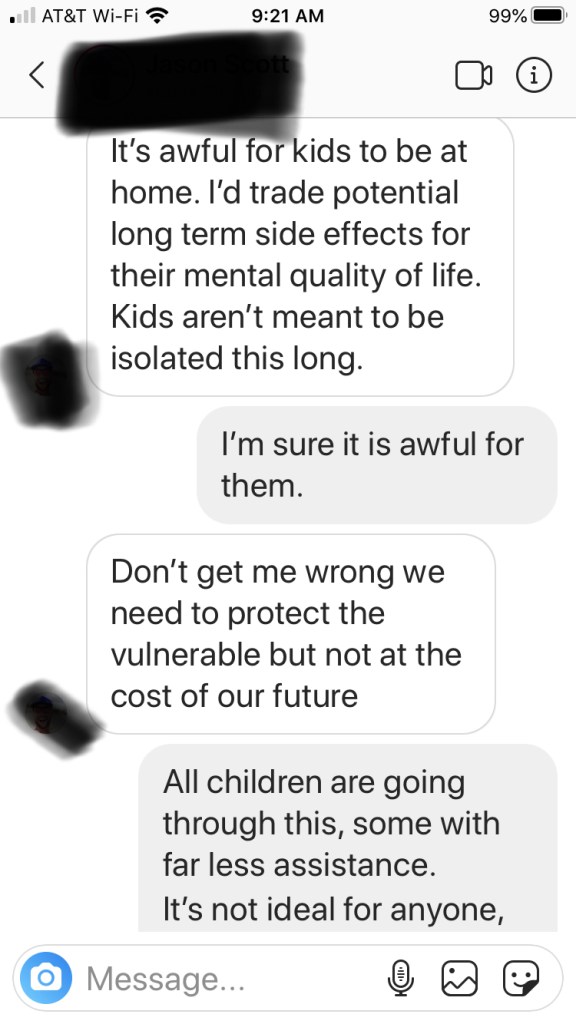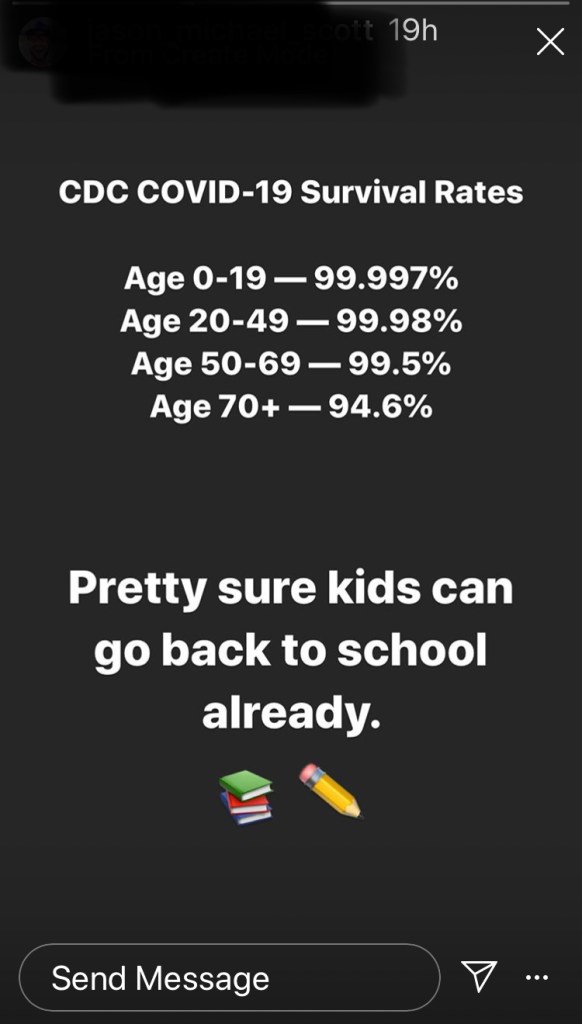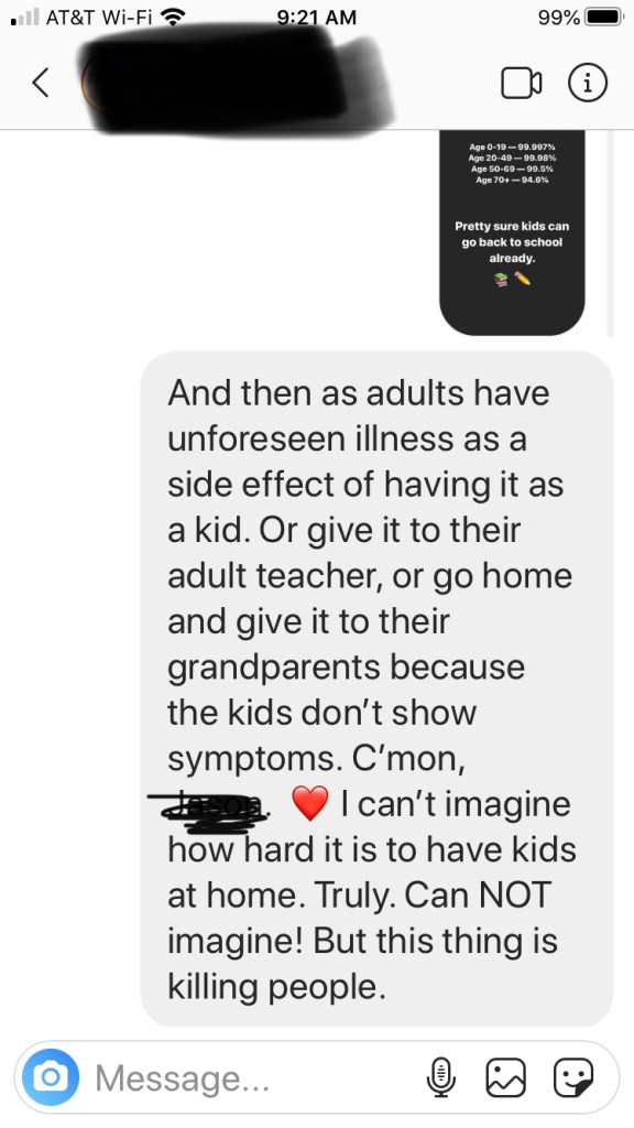 It was after this interview that I realized my trigger with my IG friend’s original post; His argument for kids going back to school should be “Studies have shown that schools are not super-spreader”. Instead, he chose to list odds of death as a valid argument for going back to school along with not being concerned about children suffering side effects of having the virus years from now.