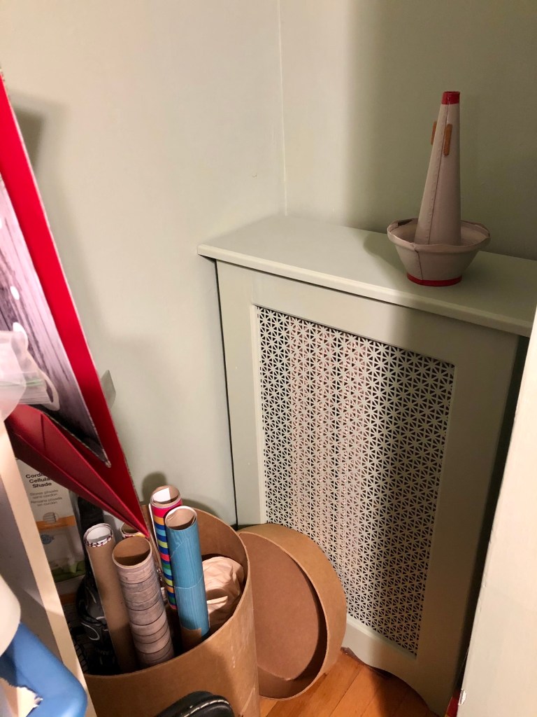 I remove the chair from above the heater, but of course that wasn’t all that had been piled up there. So I moved the cardboard pinball kit that Little and I had made before the pandemic started, and scratched my head as to how I would store it so that it would stay in one piece and not break.