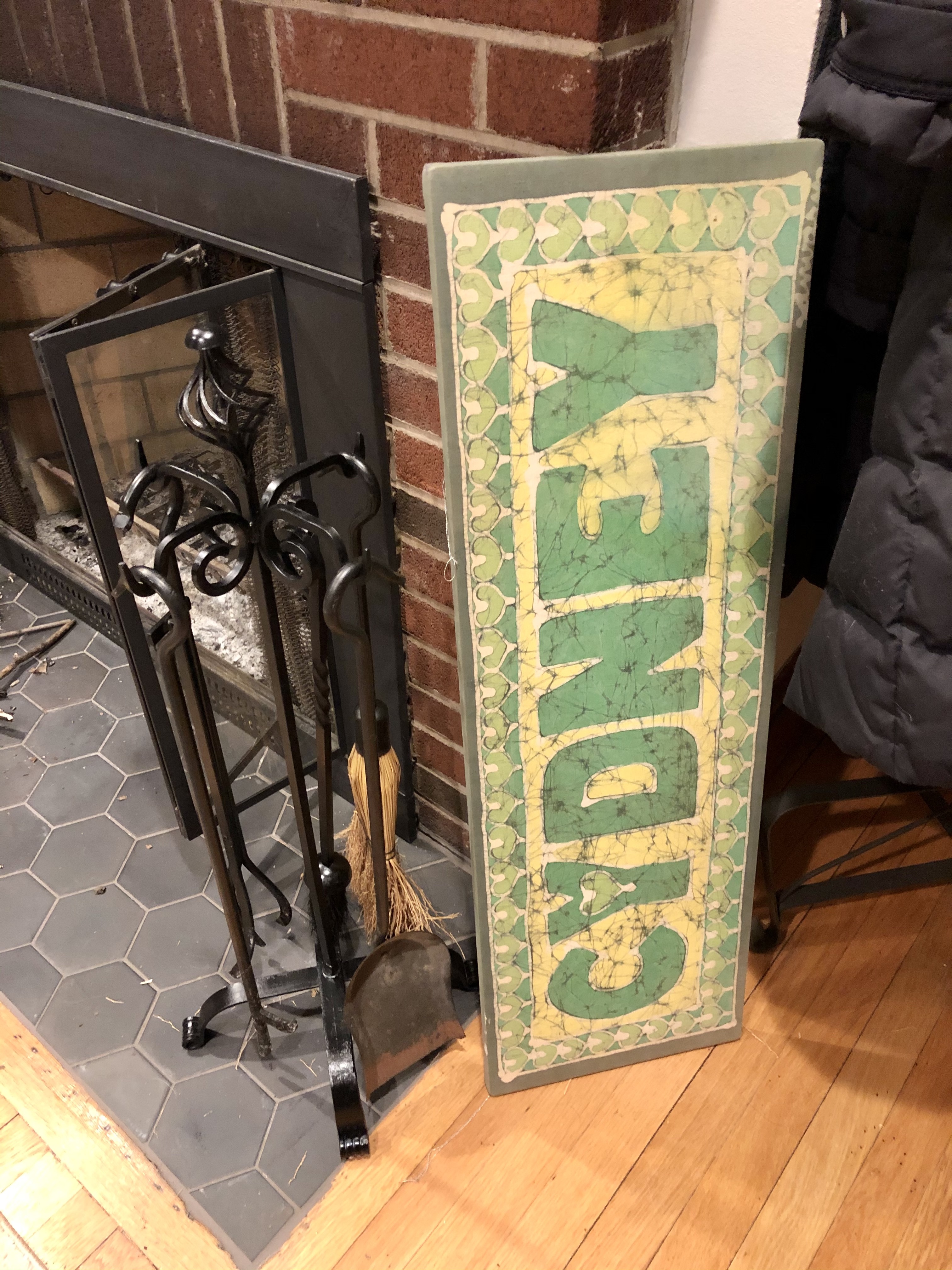 I found a random slab of wood that I later brought to the basement, as and brought from atop the bookshelf a large batik sign of my name which was made when I was a kid, and had been collecting dust here for years.