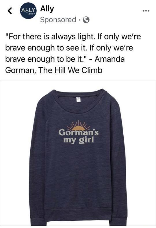 That’s right! It is a sweatshirt profiting off the success of Amanda Gorman! What can be more American and privilidgey than that?! Success that she and only she earned. And not only that, but it calls a 22 year old award-winning writer and cum laude graduate of Harvard University “girl”.
