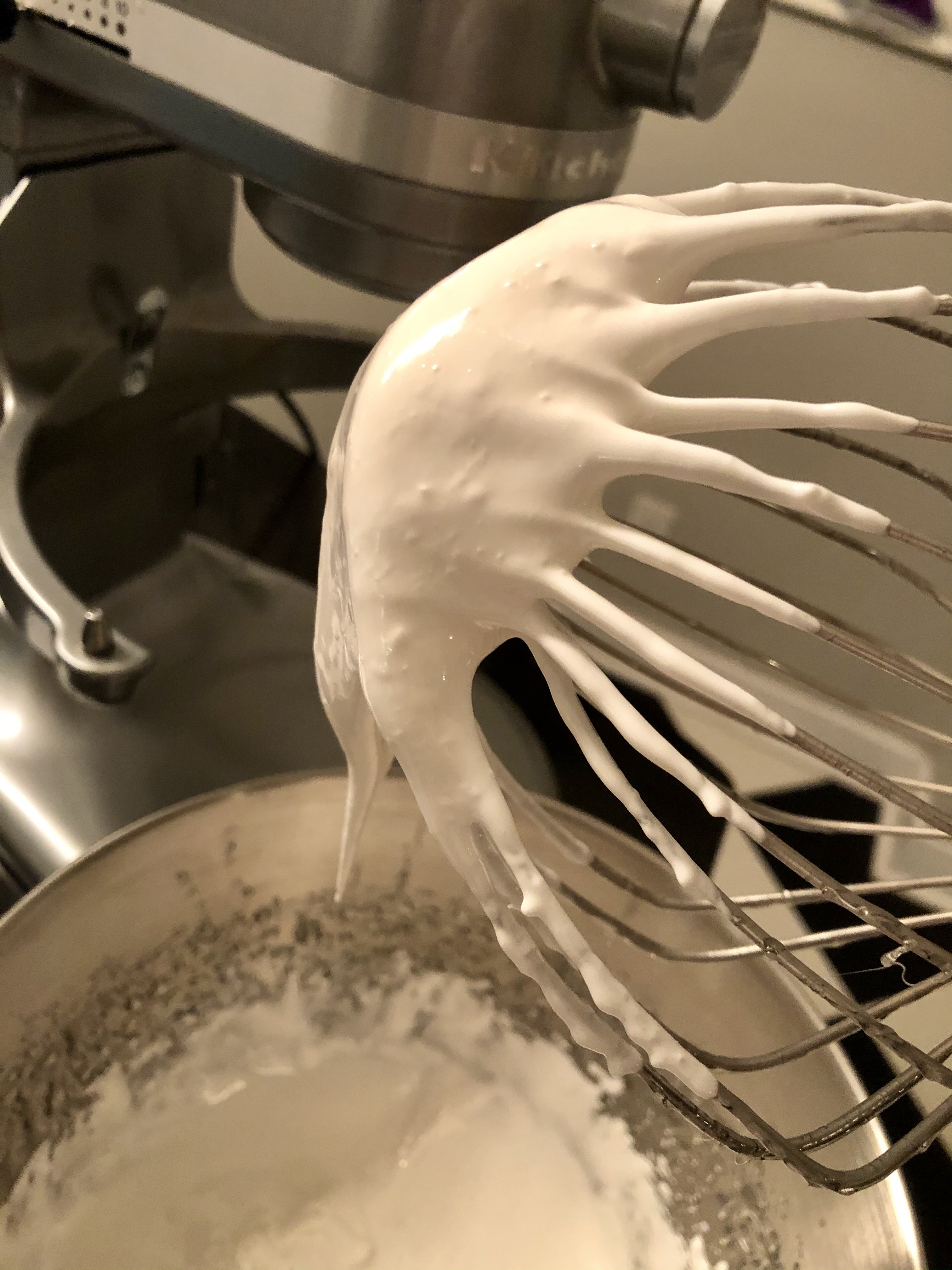 After buying and watching a merengue making course online, I was trying the Italian meringue method which called for putting half the egg whites into the dry ingredients and mixing them together to make a paste, then taking the other half of the eggs whites and whipping them while simultaneously making a wicked hot sugar syrup on the stove, bringing it to exactly 119 degrees C before carefully adding it to the egg white to turn them into soft peak meringue.