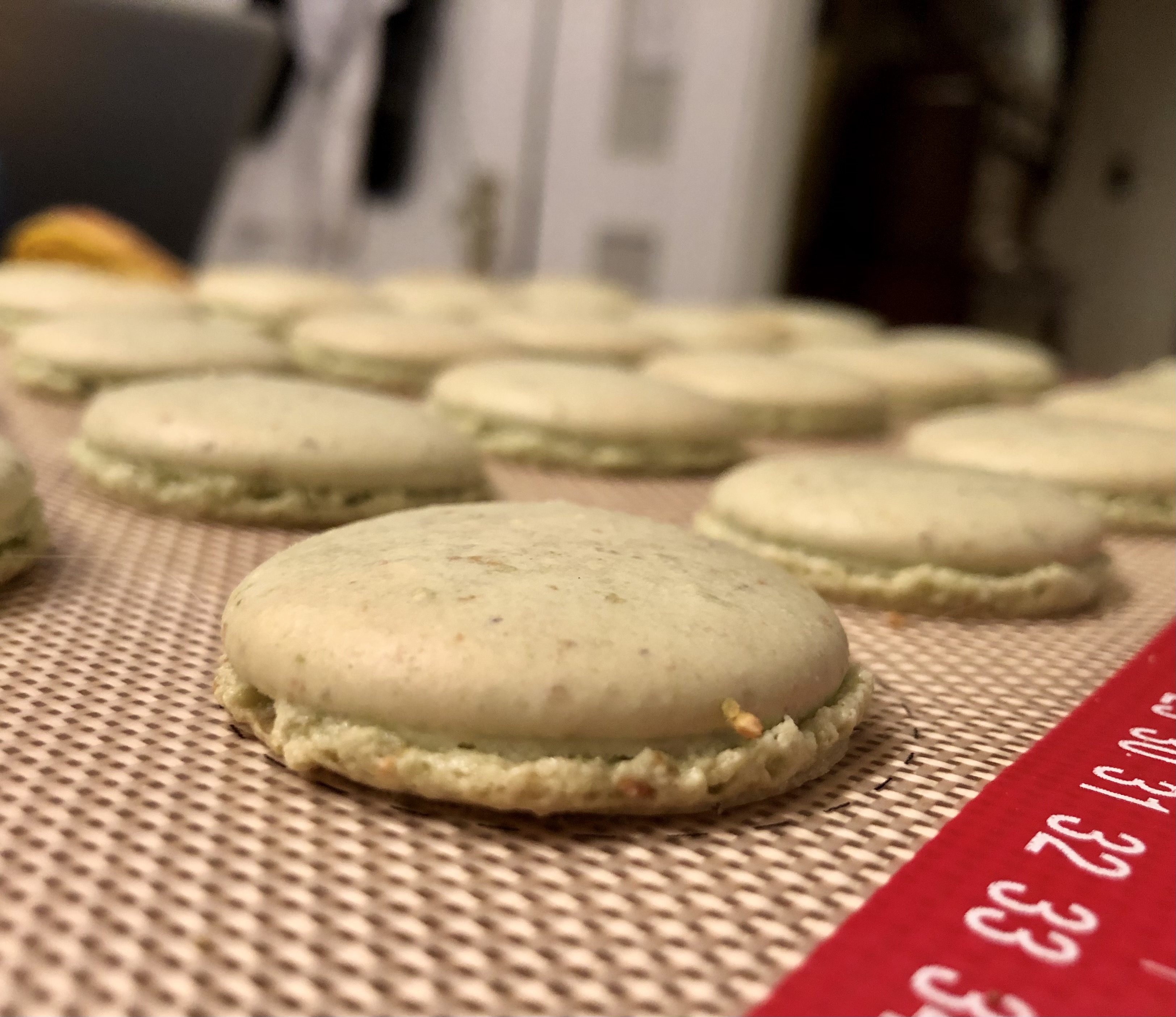 A bit later I baked the dried batter (I recently figured out that my oven runs hot by about 65 degrees, so that’s been fun), and to my shock, they are the best looking macarons I’ve made yet.