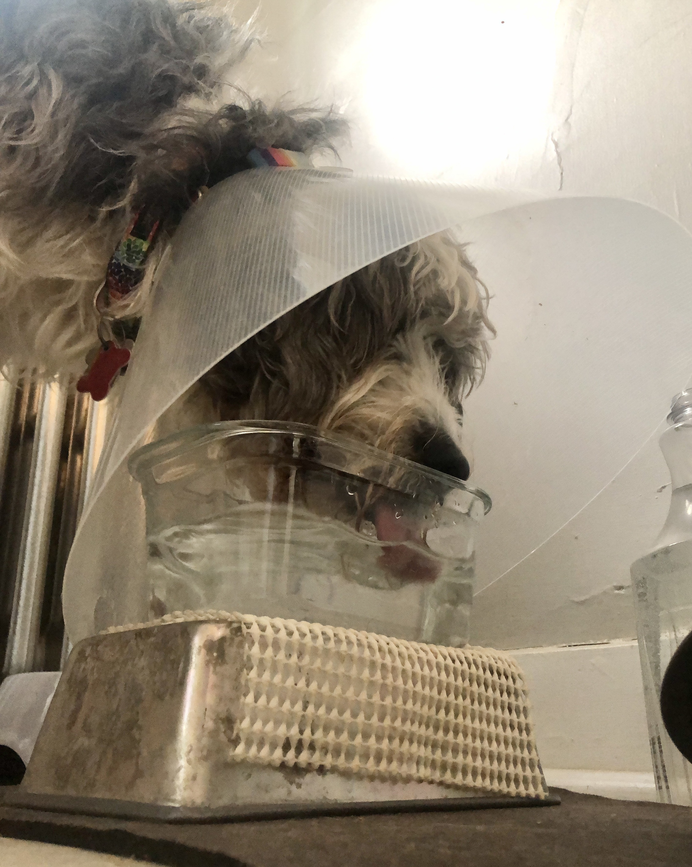 We repeated the dreadful drop-off the next day, and her surgery was done by noon. I got her in the evening and she whimpered in the back seat the whole ride home. At home, cone-on-head, she whimpered in her bed too. Poor girl.