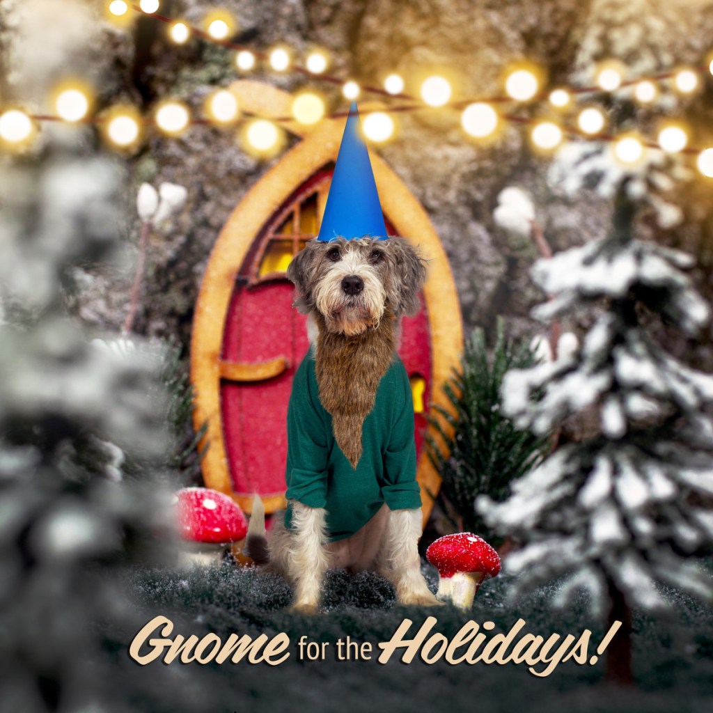 I got to play like a kid again with this year’s holiday card. I came up with the idea last year and kept it in the back of my mind until recently. I knew I wanted to play off the word “gnome” and then dress Harlow as a gnome.