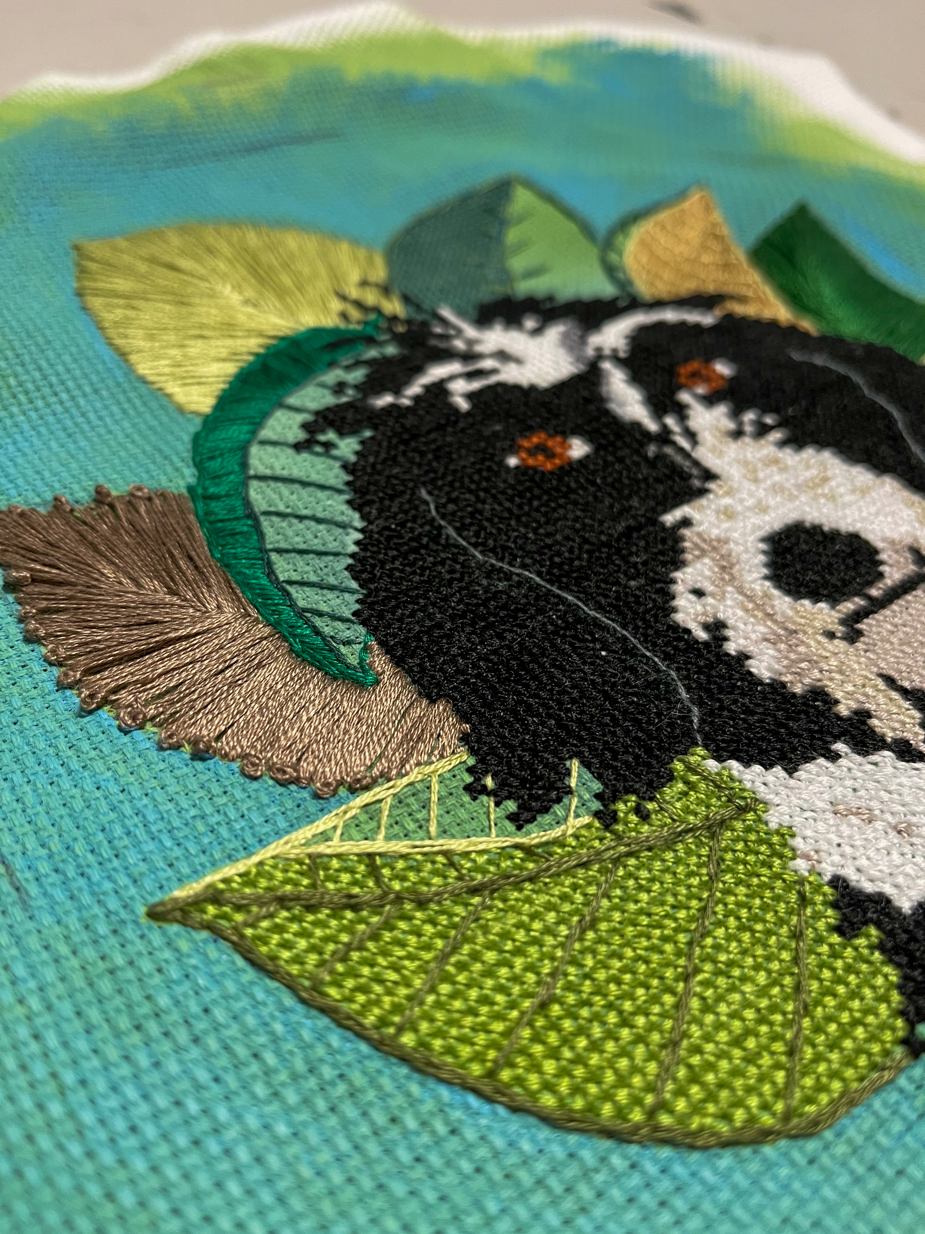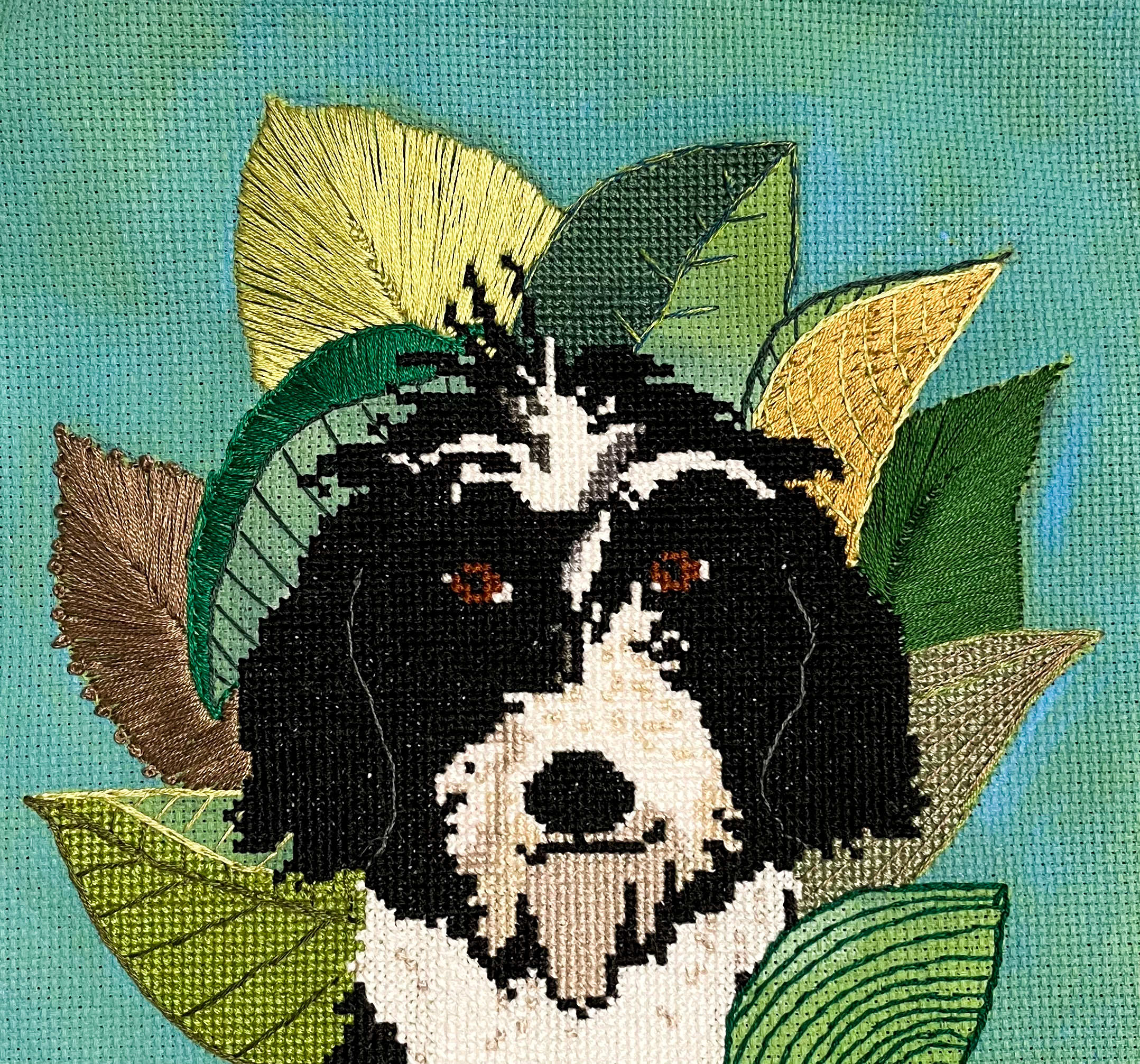 I thought about a leafy branch on either side, or a ring of vine framing her, but that didn’t seem quite right. So, I started putting large leaves around her, learning new stitches as I worked. Then I made sure to add plenty because I remembered a funny trait about Bootsie – she had to hide among the hostas and brush to go #2! Silly, shy girl.