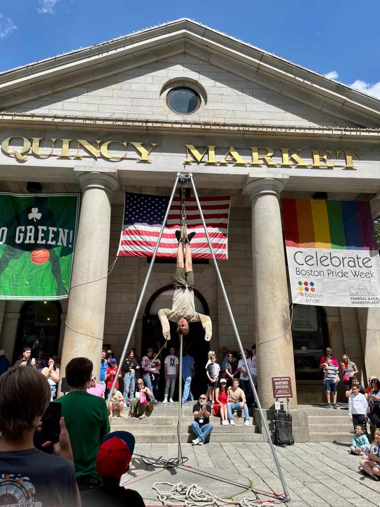 We ate lunch and people watched, then walked and came across a street performer who was chatting a whole lot before performing his escape trick. “Why is he telling us all this? Is he gonna die?!” Was her reaction. Then after the suspended upside down escape she added “He doesn’t get paid enough to do that I bet”.