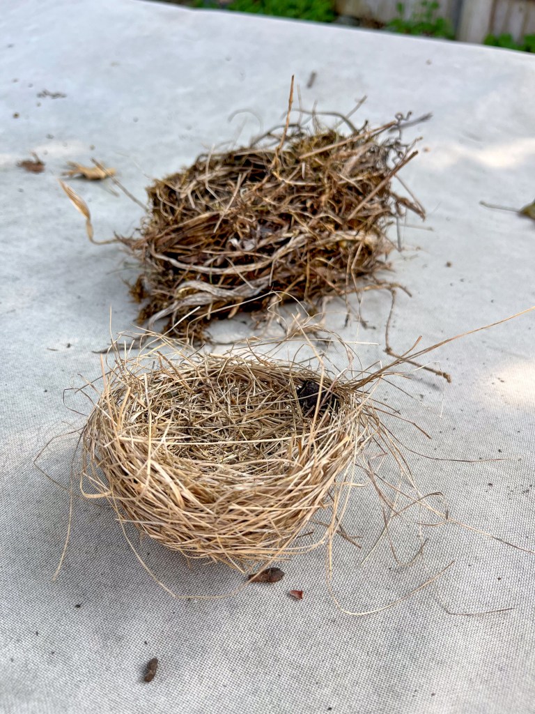 In the afternoon, Harlow and I were at the other part of the yard when I found these two very different birds’ nests on the ground in the lowest part of my property. They must have fallen from my maple.