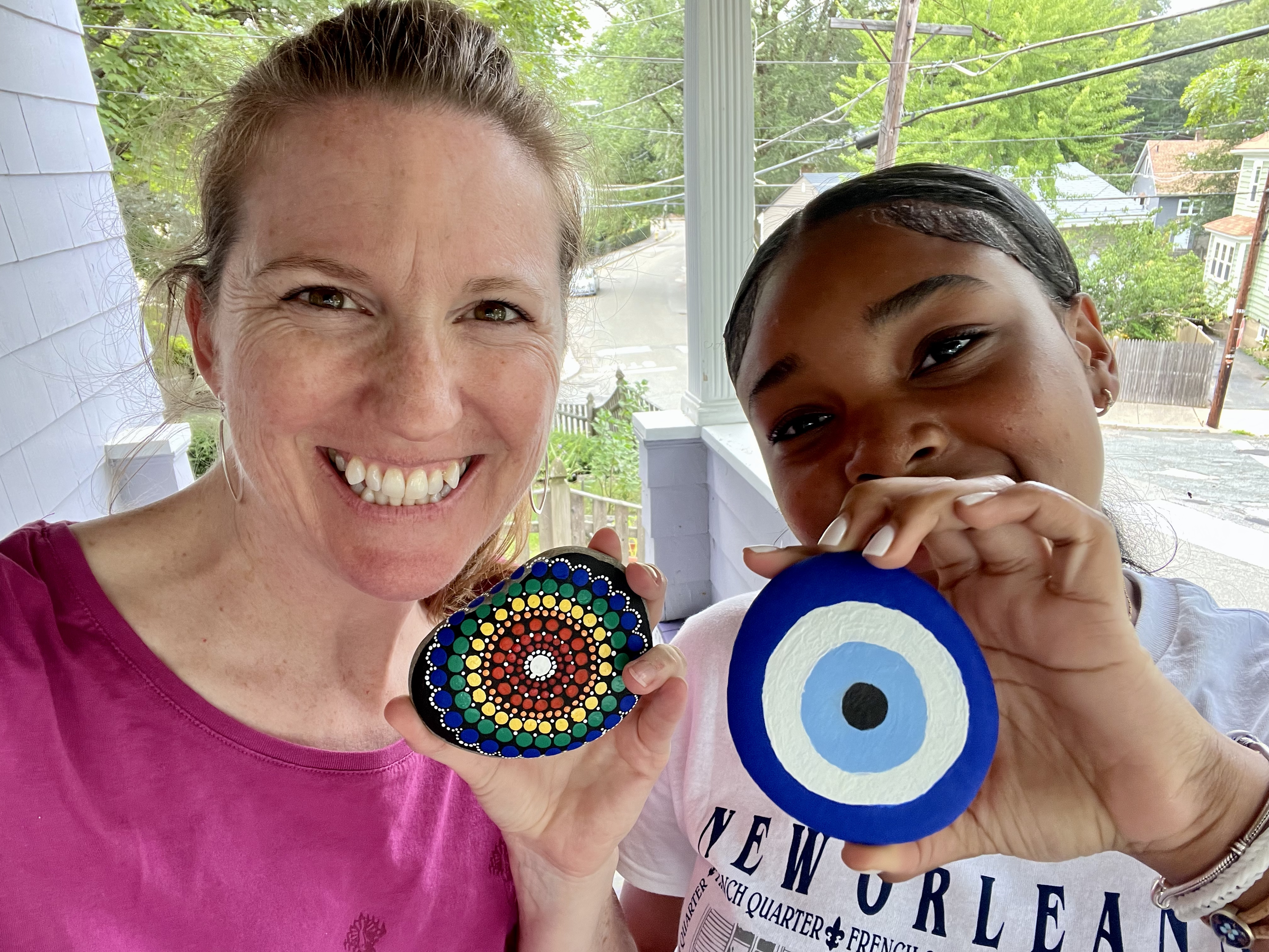 We watched a bit of The Goonies while we had lunch, churned the ice cream, and then painted some rocks which I had collected six months into the pandemic when I did a project about pandemic hobbies. A knitter with a golden retriever lived near a beach which was all large smooth rocks. So I swiped some for future project purposes.