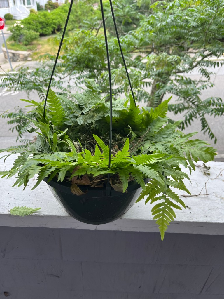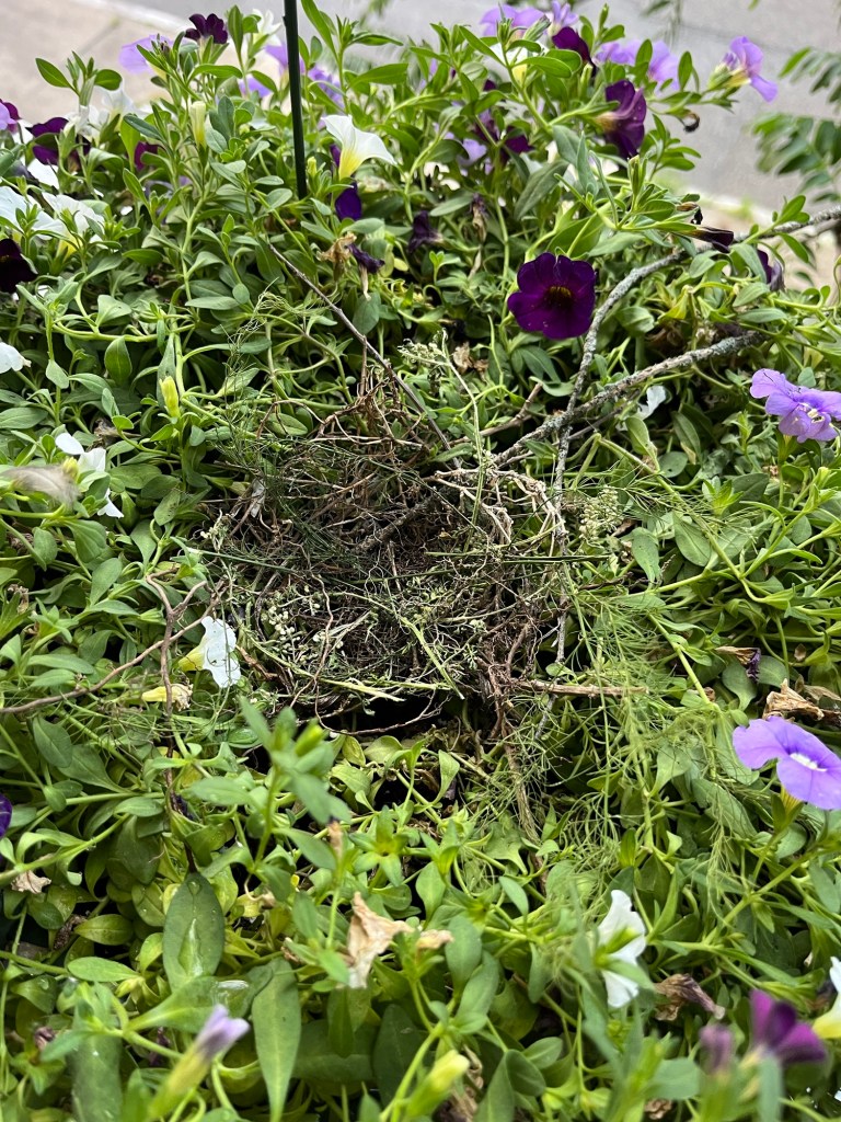 I knew I wouldn’t be able to water these beautiful flowers soon, since it would water log her nest. So I went to the basement and retrieved an old hanging pot with soil in it. I made a little wreath out for ferns for her, and carefully removed her not-yet-complete nest from the flowering pot to the soil-with-the-fern-leaf pot. I hung it up and watered my flowering pot.