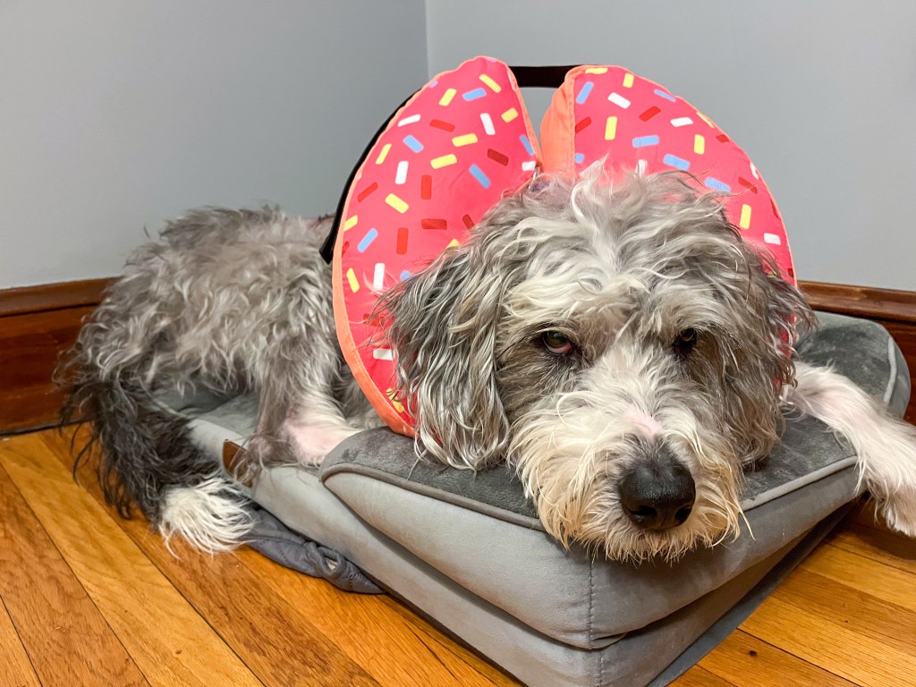 After picking her up after surgery, she stumbled like a drunkard but looked adorable in the donut I bought to keep her from accessing her stitches. She was drowsy, weak, and completely uninterested in eating at all, which made getting pain meds into her a challenge. I wasn’t too concerned because it’s not my first post-surgery dog rodeo.