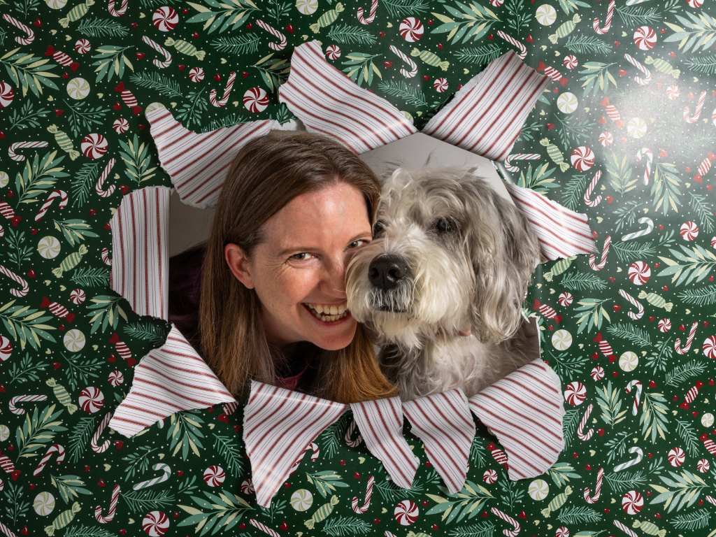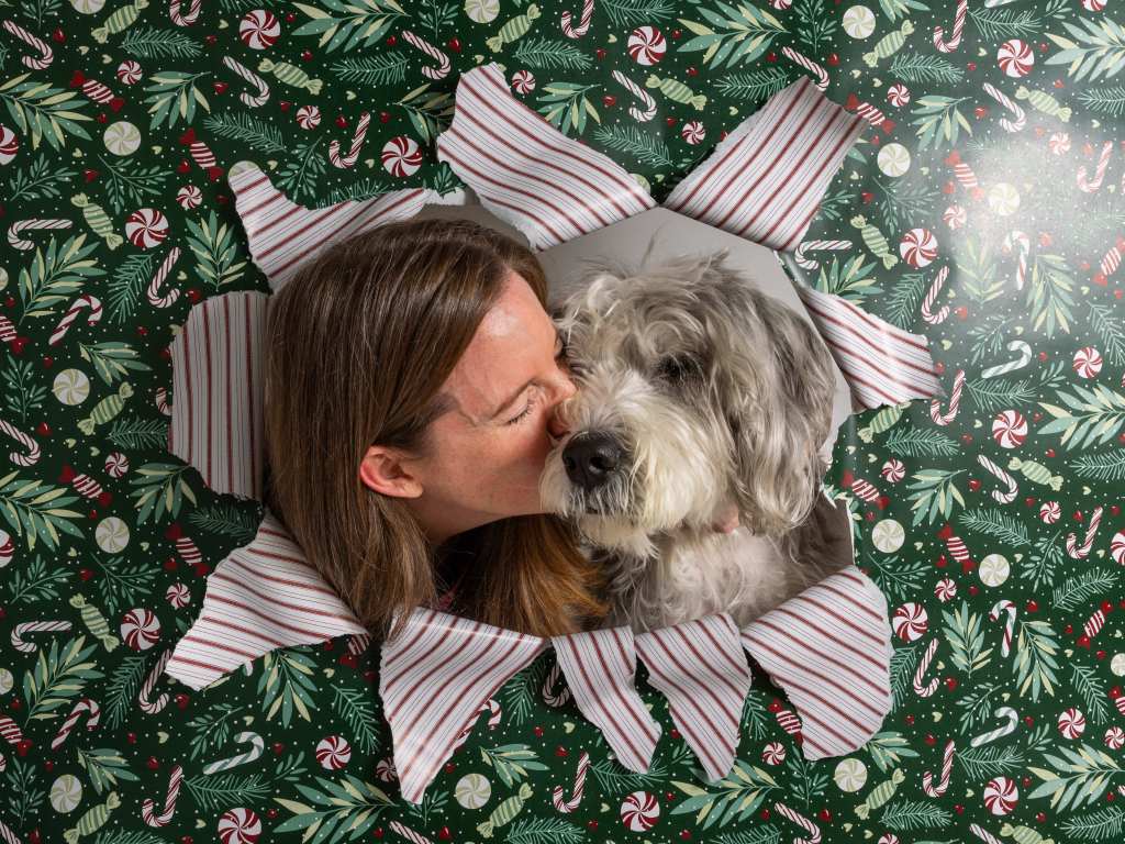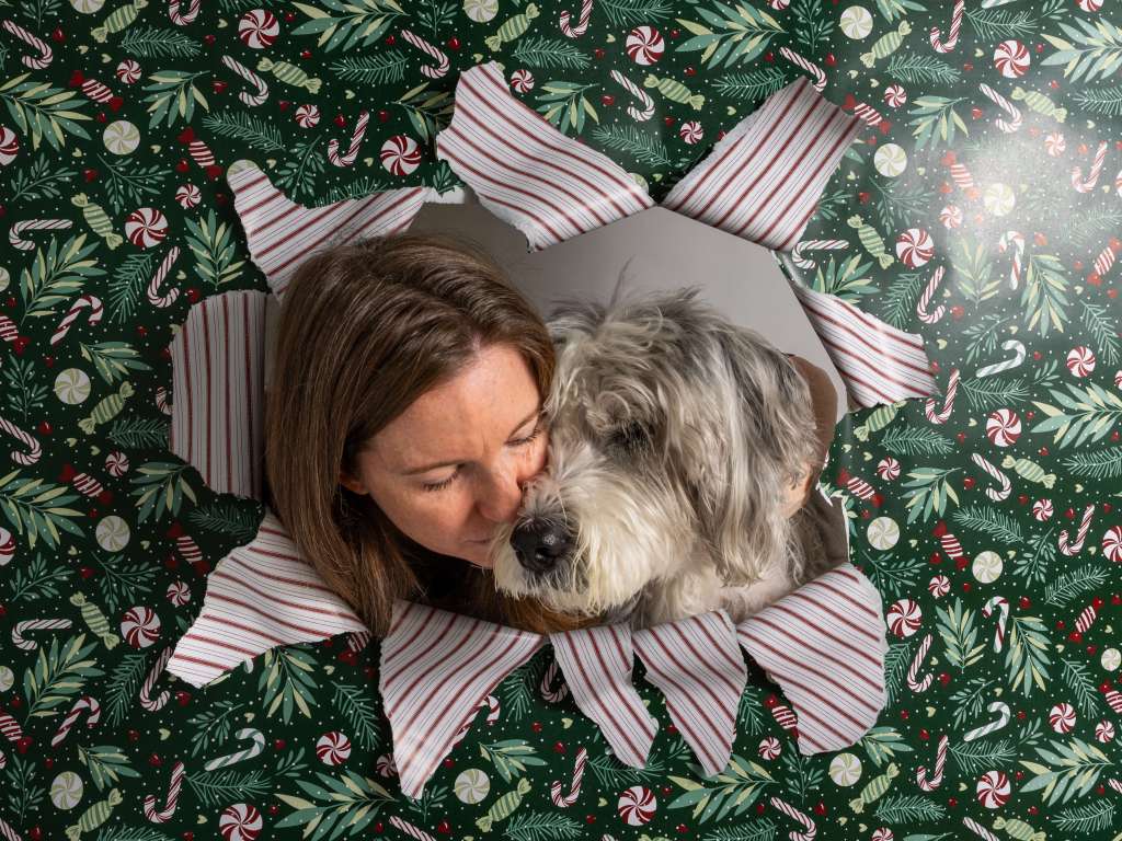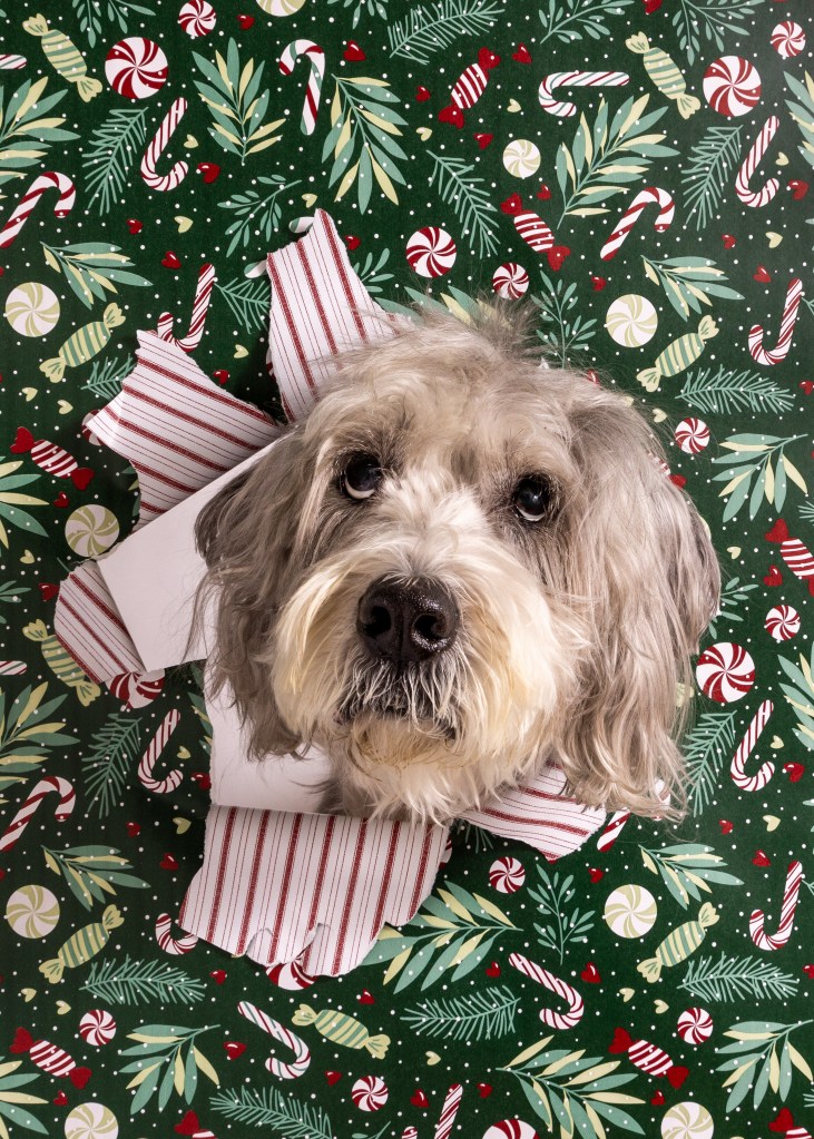 I set up a little studio in my crafting room, hanging wrapping paper from a backdrop stand, carefully ripping the paper and taping it back. Harlow experiences these photo shoots every year. I strive to give her the best treats during them, and I focus on being as quick as possible. She doesn’t find it fun but she tolerates me.
