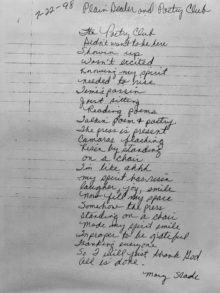 Many Strope had read a poem at the start of the meeting- she read like Maya Angelous. Before l left, she asked to read something she’d written since the start of the meeting. She read with the same strength she’d read before.